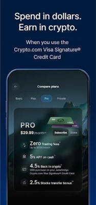 تتجاوز Crypto.com مجرد التداول لتقدم لك محفظة شاملة من المزايا المالية. مع بطاقة Crypto.com Prepaid Visa Card، استمتع بما يصل إلى 8% استرداد نقدي بعملة CRO على جميع نفقاتك، واستخدم أموالك أو اسحبها في أي مكان تقبل فيه Visa عالميًا. استفد من استردادات لرسوم الاشتراكات في خدمات الموسيقى والأفلام والتسوق مع بطاقات مختارة، بالإضافة إلى إمكانية الوصول إلى صالات المطارات. للمستثمرين في الأسهم، تقدم Crypto.com تداول أسهم بدون عمولة ومكافأة تحويل أسهم بنسبة 1.25%. كما يمكنك الاستفادة من عائد نقدي بنسبة 4.5% على أموالك. ولا ننسى برنامج Crypto Earn الذي يتيح لك الاستمتاع بمكافآت وشروط مرنة على أكثر من 40 رمزًا رقميًا وعملة مستقرة، بالإضافة إلى Crypto.com Pay التي تمكّنك من الدفع بأكثر من 30 عملة مشفرة والحصول على مكافآت مع تسويات فورية وبدون رسوم غاز.