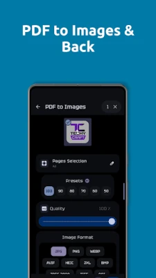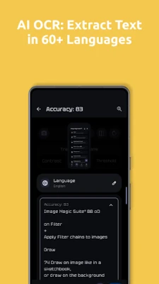 لا يقتصر Image Magic Suite على التعديل البصري فحسب، بل هو أيضاً محطة تحويل قوية تدعم نطاقاً واسعاً من التنسيقات. حول بين HEIC، AVIF، JXL، WEBP، PNG، JPG، GIF، APNG، PDF، SVG، وغيرها الكثير بسلاسة تامة. أعد تشكيل ملفات GIF أو الرسوم المتحركة إلى صور ثابتة، WebP، APNG، أو JXL متحرك، واستخرج أغلفة الصوت، أو حول الصور إلى صيغة SVG المتجهة، وقم بالضغط الذكي للصور باستخدام تقنيات MozJPEG و Jpegli المتقدمة. بالإضافة إلى ذلك، يضم التطبيق أدوات قوية للمستندات، تتيح لك مسح المستندات ضوئياً إلى صور أو ملفات PDF، وتحويل ملفات PDF إلى صور والعكس، مع دعم استثنائي للتعرف الضوئي على الحروف (OCR) بأكثر من 120 لغة، مدعوماً بخيارات Tesseract المتطورة.